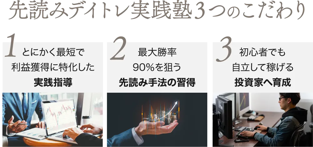 先読みデイトレ実践塾は、”何よりも”目の前の利益を掴んでもらうことを最優先している塾です。