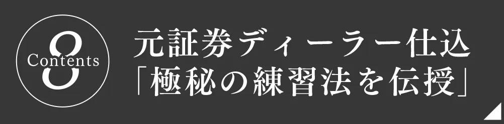 私を信じて飛び込んできてくれた方には、証券ディーラーが極秘で使ってきた「先読みの技術」や株歴35年のすべてをあなたに伝授します。